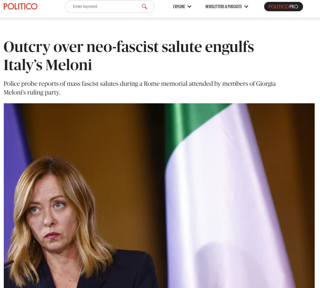 Politicon mukaan kyseessä olivat Italian hallitsevan puolueen nuorisojärjestön jäsenet, jotka kättä ojentaen halusivat kunnioittaa vuonna 1978 tapahtuneita puolueensa jäsenten murhia.